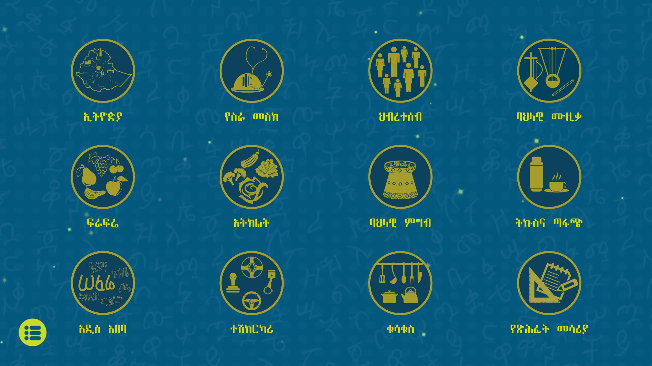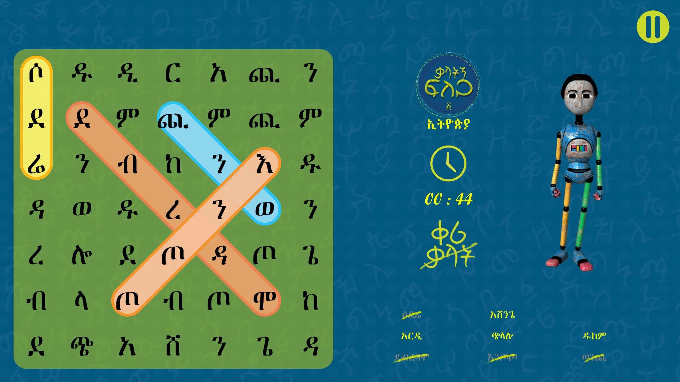Amharic is the official language of the East African country of Ethiopia. This wordsearch puzzle is designed for the Amharic language speakers or people who are learning the language. The puzzles contain over 1300 words organized in 37 categories and three levels. The easy level comes in 7x7 grid, medium level comes in 9x9 grid and the difficult level comes in 11x11 grid respectively. The grids are filled in with the alphabets of the language (a character set called Ethiopic or Gee'z) which is the written form of the Amharic language.