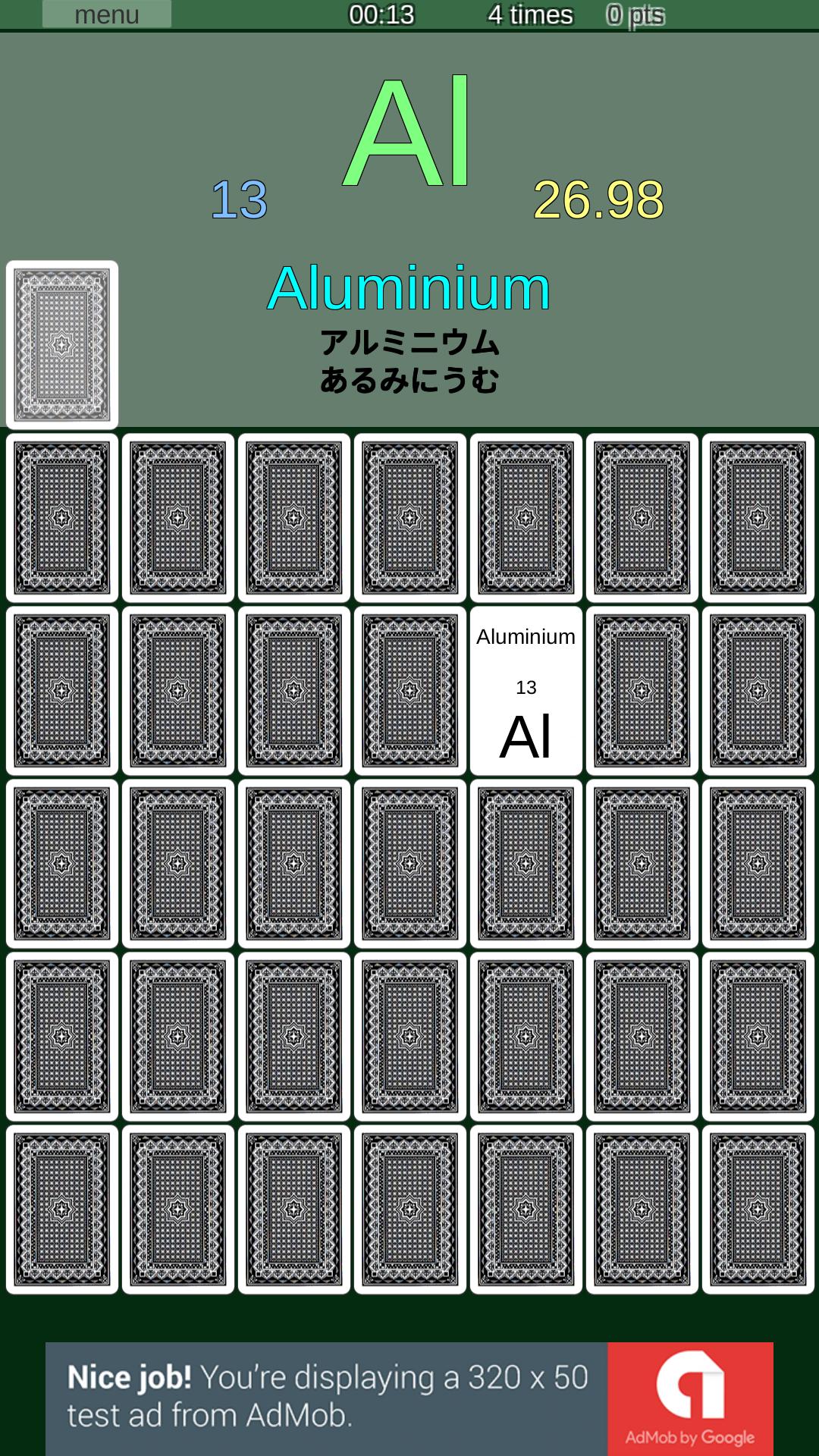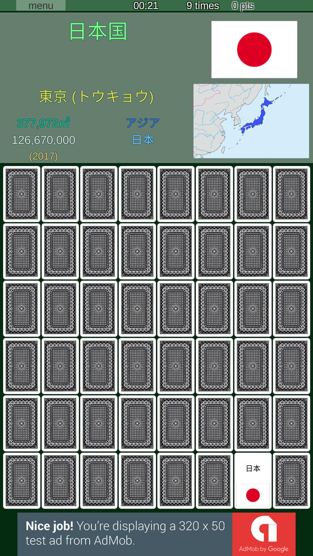 This is Matchup (Memory or Concentration) game. There are sets of "Cards", "National flags", "Japanese kana", "English Alphabet", "Atomic symbols" and "Japanese Kanji" (All Kanji taught at elementary school). Sequentially,I am planning to add a new card set. I am planning to increase the contents especially for those who want to learn about Japanese and Japan. (For now, only "Japanese Kana", "Japanese Kanji" and "Japanese Map" are available.)
