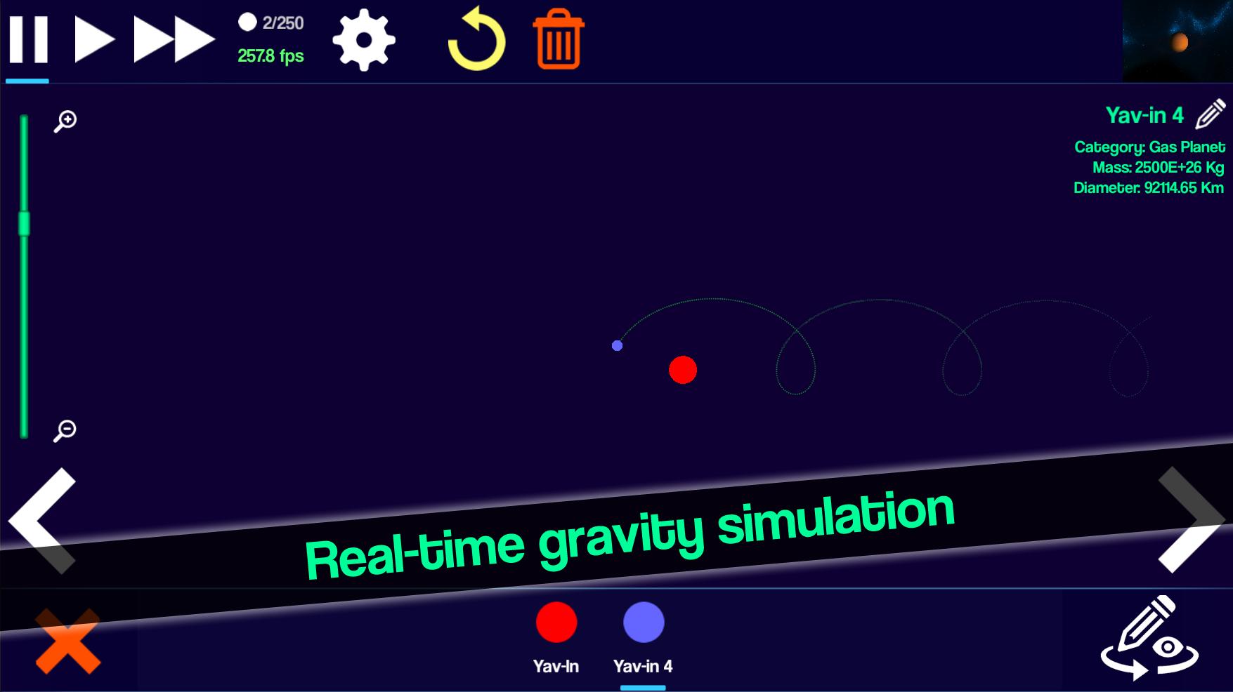 Planet Genesis is one of the finest and most visually stunning space sandboxes available for Android devices. Any person can now discover by himself how gravity affect and change objects in space. By just a finger touch, you can create asteroids, planets, stars (even black holes!) and watch them interact and orbit in a realistic way. Design your own solar systems!