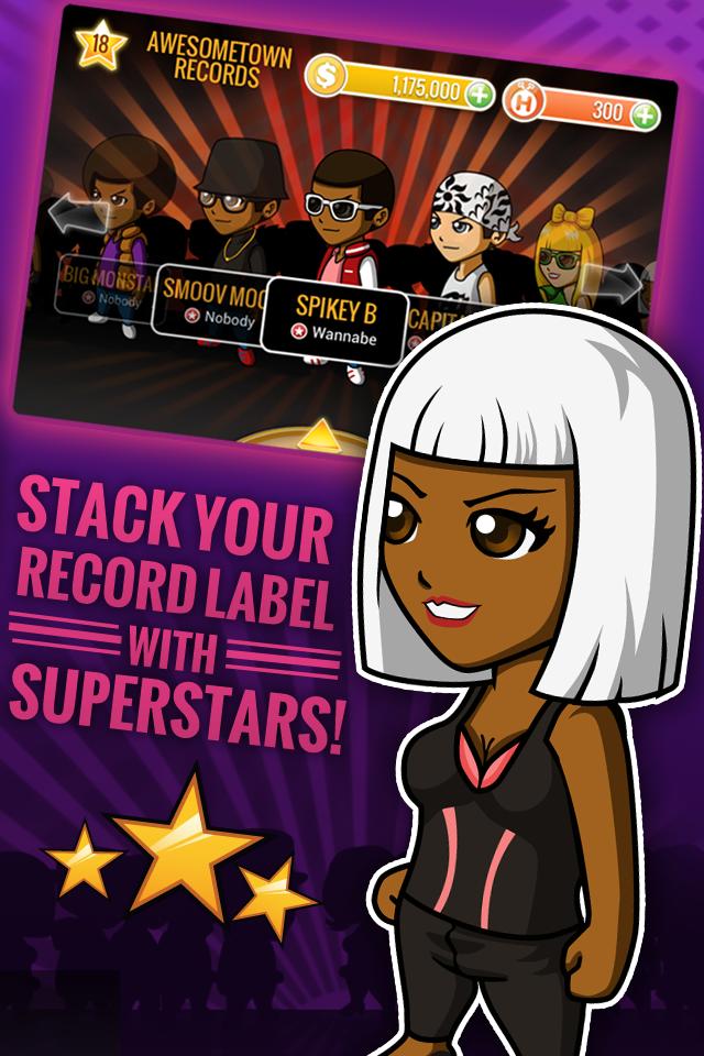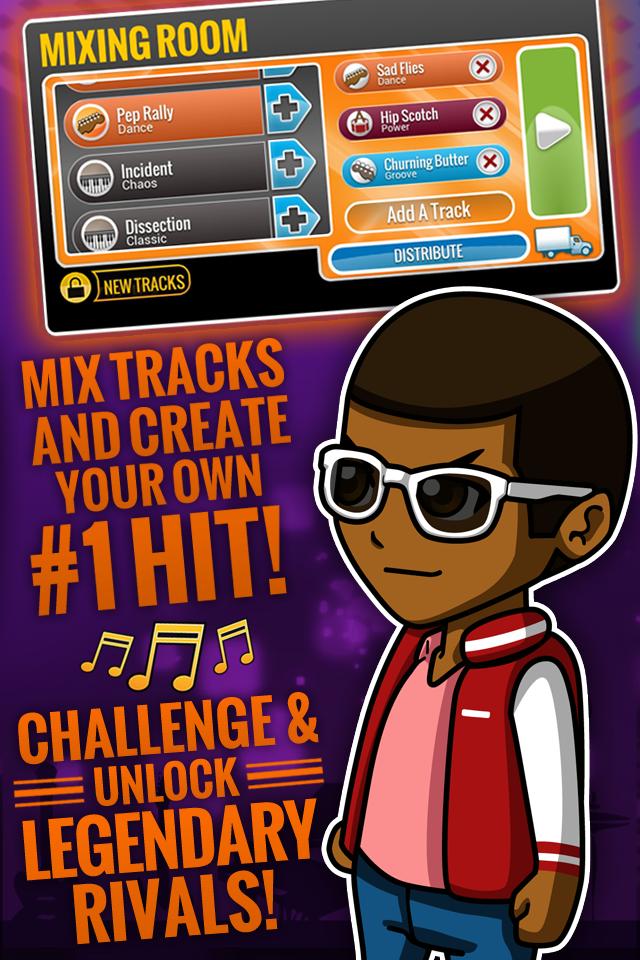 Music Biz features custom beat mixing technology. Be your own composer! Create your own songs by mixing tracks acquired in the game and share them with your friends.