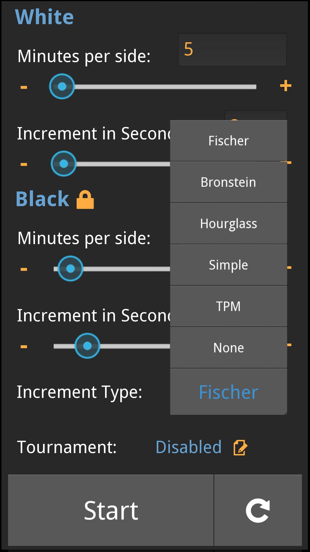 •Fischer, Bronstein, Hourglass increments, Time per Move and Simple delay.