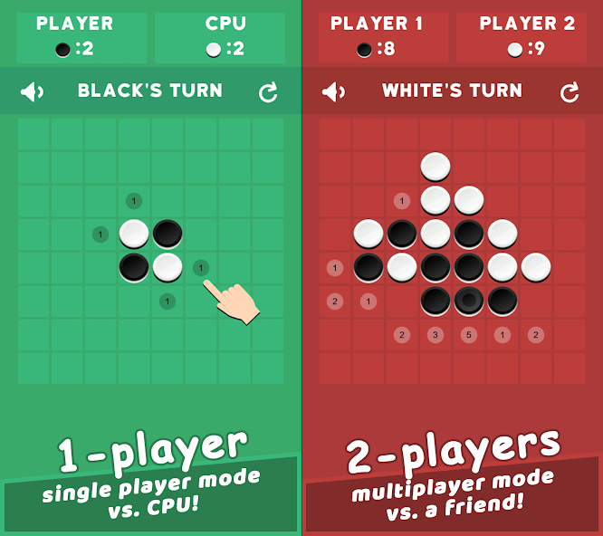 ★ The winner is the one with the most pieces when no more pieces can be played on the board. Game is over when the entire board is filled or when no side can make a valid move.