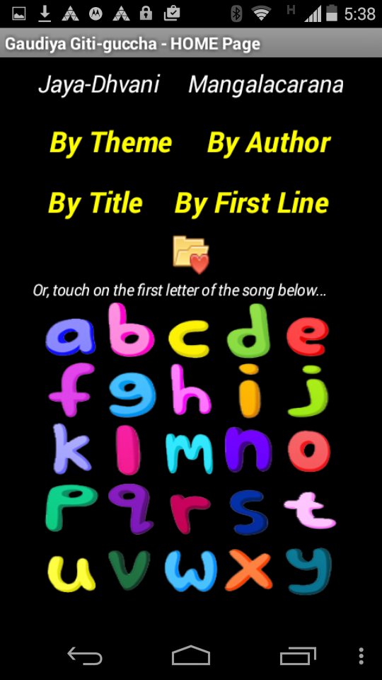 Aplikasi Gaudiya Giti-guccha menyajikan seluruh kumpulan bhajan dan doa Gaudiya terbaru dan klasik yang disusun oleh Srila Bhakti Vedanta Narayana Goswami Maharaja dan diterbitkan oleh Gaudiya Vedanta Publications (GVP).