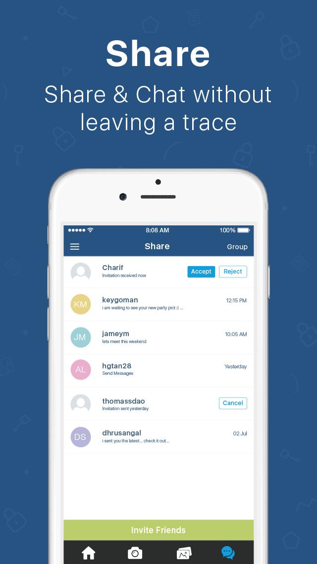 Bagikan foto atau mengobrol, satu per satu atau dalam grup. Hapus apa pun dari aliran obrolan Anda dan menghilang dari kedua sisi. Atau Anda dapat mengatur timer penghancuran diri. Pesan Anda dienkripsi sehingga hanya orang yang Anda kirim untuk membacanya. Baik Keygo atau orang lain tidak memiliki akses.