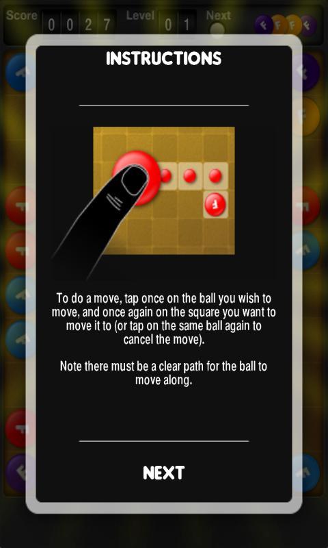 Pindahkan bola di sekitar papan untuk membuat garis lima bola dengan warna yang sama, sehingga menghilangkan bola. Setelah setiap gerakan lain yang Anda lakukan, lebih banyak bola ditambahkan. Tujuannya adalah agar papan tidak mengisi selama mungkin.