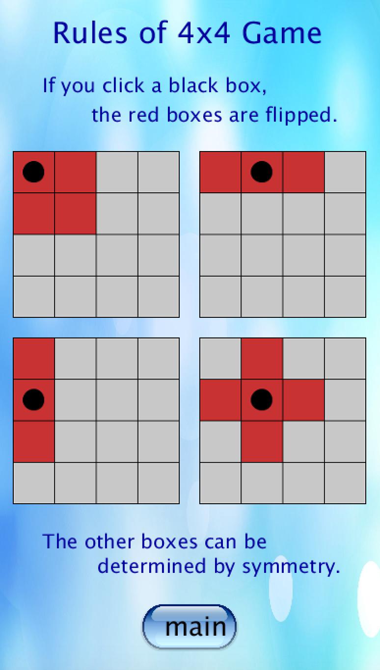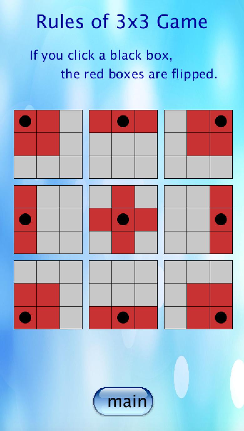 Tujuan utama dari permainan ini adalah mengisi seluruh papan dengan O's. Tetapi ketika Anda mencoba dan melakukan itu ada pola tertentu yang mengubah O menjadi X dan X menjadi O's. Ada tiga mode permainan: 3x3, 4x4, 5x5. Mulailah dengan 3x3 dan saat Anda mendapatkan kemajuan yang lebih baik melalui mode game lainnya untuk tantangan yang lebih sulit. 3x3 cukup mudah, 4x4 sangat sulit dan 5x5 seperti neraka.