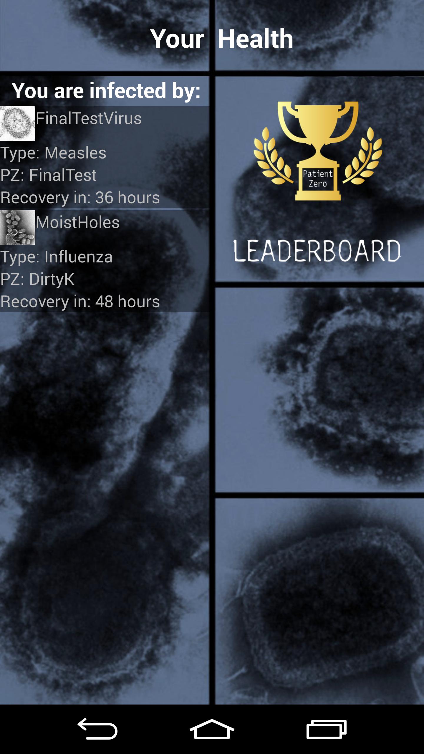 Patient Zero adalah simulator pandemi virtual di mana Anda bisa menginfeksi pemain sungguhan. Infeksi ditransfer oleh pemain yang berada di dekat satu sama lain di dunia nyata. Pemain yang terinfeksi virus Anda akan membawanya dan menginfeksi lebih banyak pemain. Lihat seberapa cepat virus unik Anda menyebar!