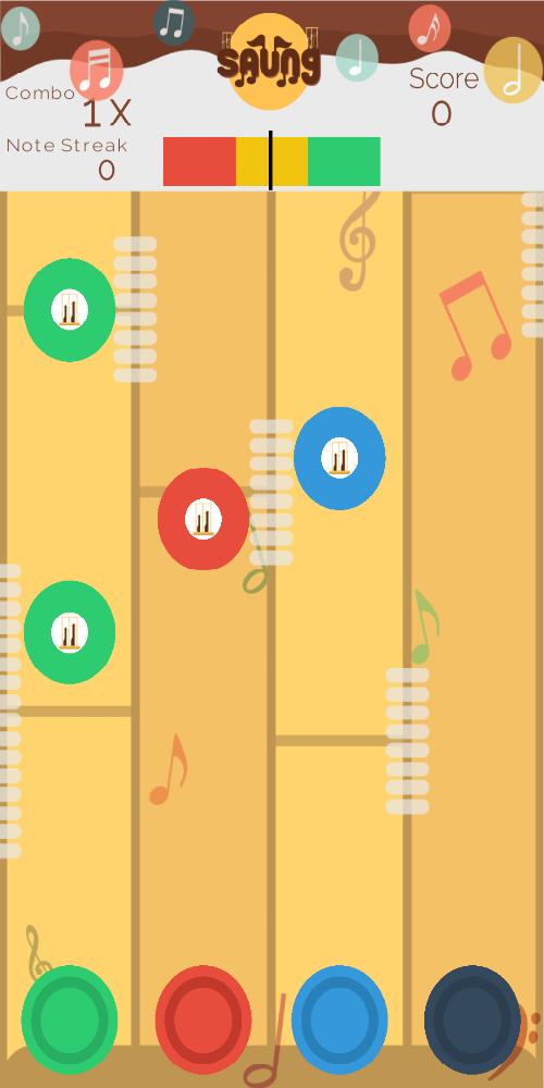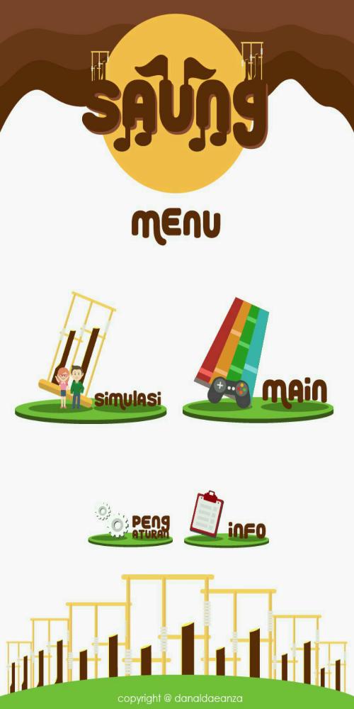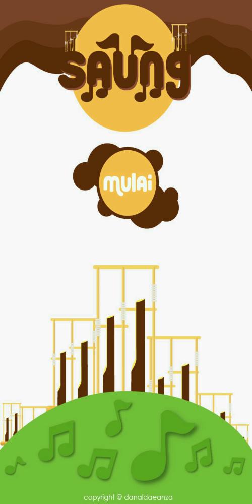 Saung merupakan aplikasi yang dapat digunakan oleh pengguna untuk memperkenalkan suara angklung dengan memberikan unsur multimedia agar menarik saat digunakan. Terdapat dua fitur yang dapat digunakan yaitu fitur simulasi dan fitur main. Pada fitur simulasi pengguna dapat menyimulasikan note satuan dengan menggoyangkan perangkat seluler sedangkan pada note banyak cukup dengan menyentuh bilah angklung. Fitur main menyuguhkan permainan musik dimana lagu yang dimainkan merupakan lagu dengan suara angklung dan ditambah harmoni dengan alat musik lainnya.
