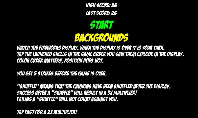 花火のディスプレイをご覧ください。ディスプレイが終わったとき、それはあなたの番です。発売されたシェルをタップして、ディスプレイで爆発するのを見たのと同じ色の順序でタップします。シェルの色が重要であり、シェルの位置は重要ではありません。