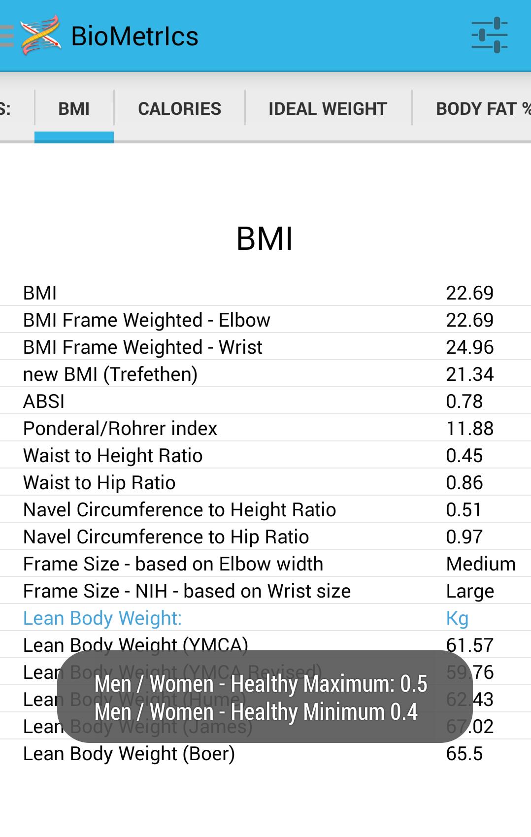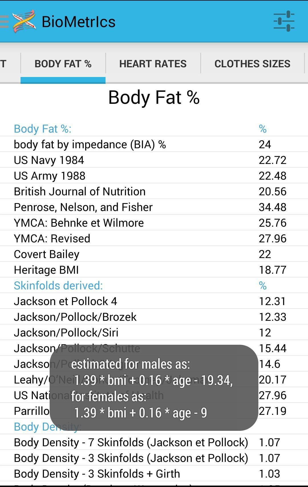 Ever needed to know your hat size, guestimated body fat or current fitness level? If you have then this app aims to provide a handy store for your vital statistics (circumferences, tailor measures, DNA, blood content, heart rate, BIA data, etc), along with offering a one stop shop for the common formulaic derived BioMetrIcs you may occasionally require, wish to contrast with another formulation of the same metric, discount, share or learn something about. Such as your: Japanese shoe size, glove size, BMI, newBMI, ABSI, BAI, Ponderal Index, a plethora of estimated daily calorie requirements (BMR / RMR / BEE / ERR / TDEE), Body Surface Area (BSA), international clothes sizes, target training and maximum heart rates, ideal weight, body composition, body fat and lean mass (LBW), waist to hip and height (WHtR) ratios, somatotype (Heath-Carter and Rempel) classifications, body type, body shape, body density (BD), heart rate derived fitness estimates (VO2, VO2Max, MET / vVO2Max), body water (TBW / ICW), lung capacities (FVC / FEV1 / FEV1% / FRC / RV / TLC / DLCO), DNA derived haplogroup (common ancestor) predictions, estimated blood and breath alcohol levels, from consuming a single unit, estimated step length and more.
