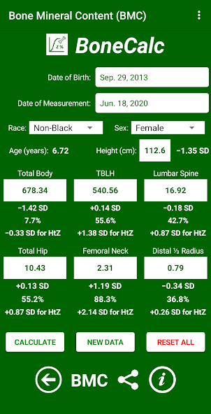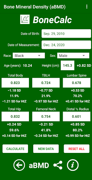 This app is designed for the calculation of Z-scores and percentiles for bone mineral content (BMC) and areal bone mineral density (aBMD) for children ages 5–20 years, as measured by dual-energy X-ray absorptiometry (DXA), for the following sites: total body, total-body-less-head, lumbar spine, total hip, femoral neck, and distal ⅓ radius. Cálculos separados estão disponíveis por idade, sexo e raça (preto e não-preto). Os escores Z ajustados por altura-Z para essas medidas também são calculados. Os dados de BMC e ABMD são derivados da densidade mineral óssea no estudo da infância [Zemel B et al., J Clin Endocrinol Metab 2011; 96 (10): 3160-3169]. Os cálculos também estão disponíveis para a densidade aparente do mineral ósseo da lombar-espinha (BMAD) [Kindler JM et al. J Clin Endocrinol Metab 2019; 104 (4): 1283-1292].