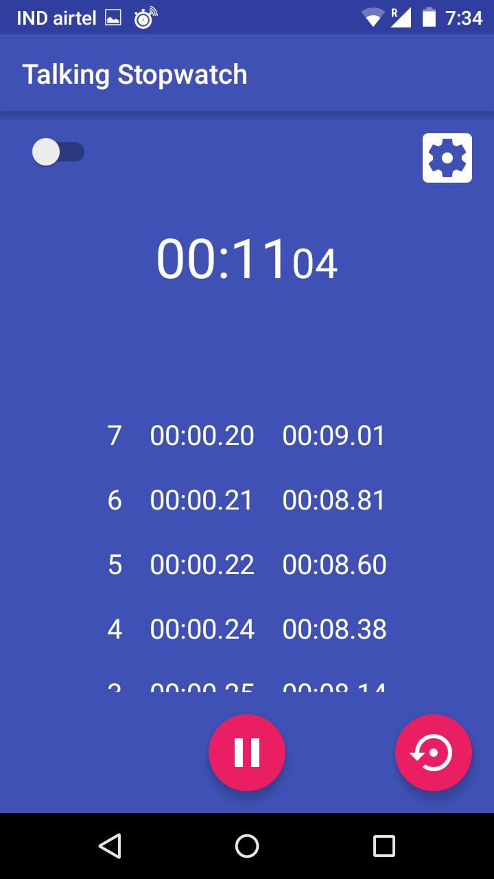 Apresentando ' Talking Stopwatch ', Stopwatch simples, mas poderoso. Não há necessidade de olhar para o cronômetro para o tempo decorrido, o Talking Stopwatch falaria com você sobre o tempo decorrido. A contagem pode ser parada e retomada. O intervalo de notificação de voz pode ser configurado.