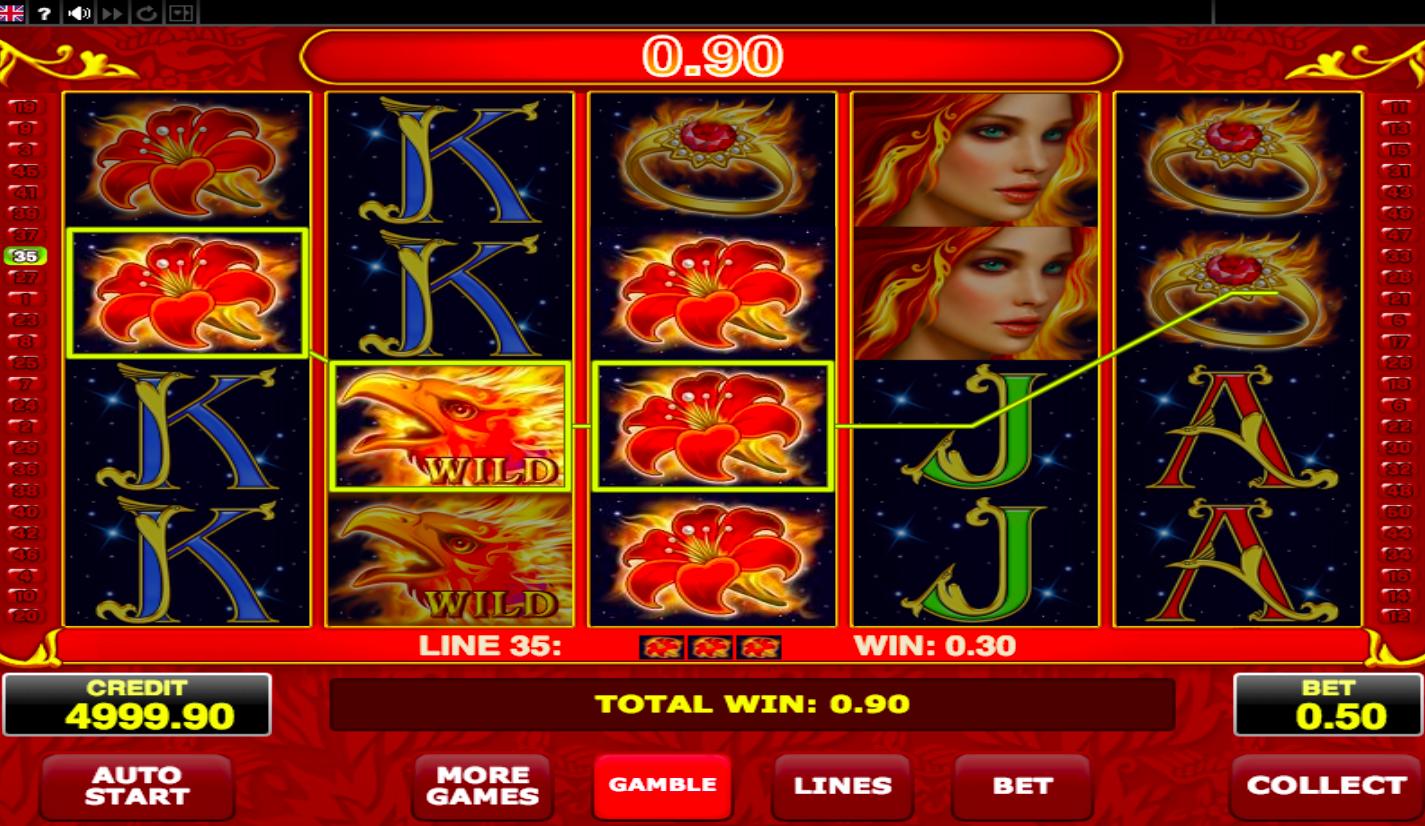 O slot Arising Phoenix de nossos desenvolvedores, é dedicado ao famoso pássaro que se eleva de suas próprias cinzas, portanto seu design apresenta tudo o que está relacionado ao Phoenix. Você pode fazer apostas em 50 linhas de pagamento, formadas em 5 rolos com 4 linhas cada. A imagem de uma garota bonita com cabelo flamejante traz os maiores recompensas se ocupar todas as células no campo de jogos. No entanto, o ícone mais gratificante é o símbolo selvagem que descreve a fênix com a escrita "selvagem". Se o símbolo selvagem aparecer em qualquer um dos rolos, uma rotação de bônus gratuita será lançada instantaneamente. Durante a rotação, o carretel com o símbolo selvagem permanece fixo, aumentando assim as chances do jogador de ganhar o jackpot.