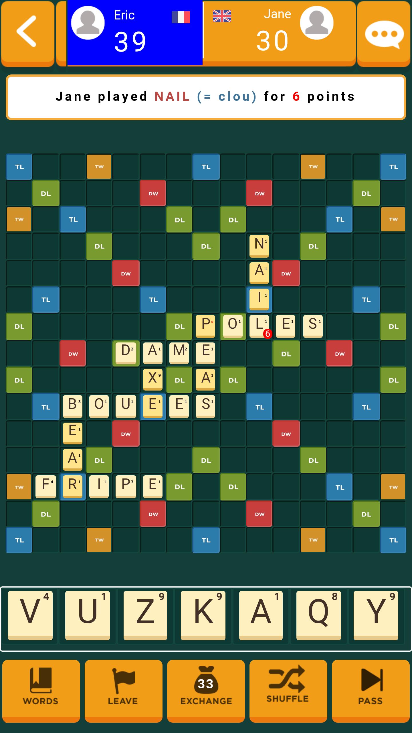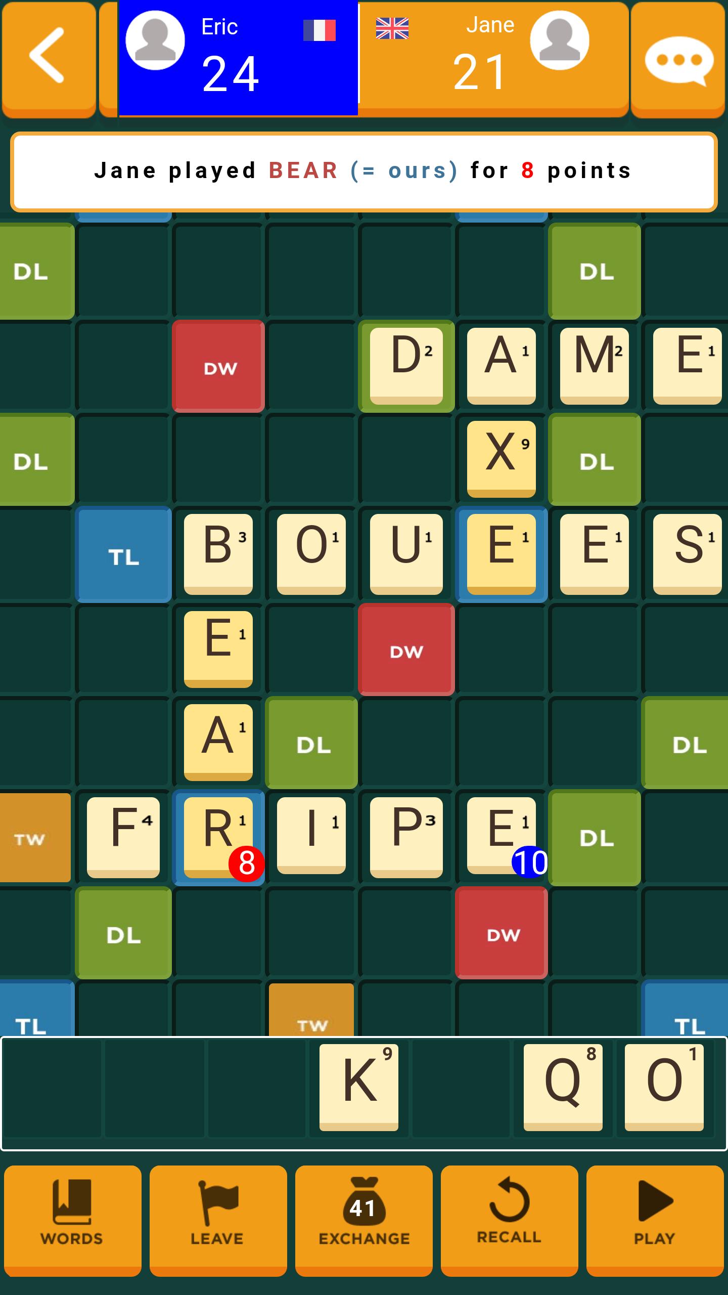 Para jogar, você precisa fazer palavras no quadro usando as letras no seu rack. Otimize sua pontuação com células especiais («letra dupla», «Palavra tripla» ...) e usando ladrilhos de letra de altos valores para fazer palavras raras por conta própria ... ou reutilizar as palavras feitas pelo seu oponente.