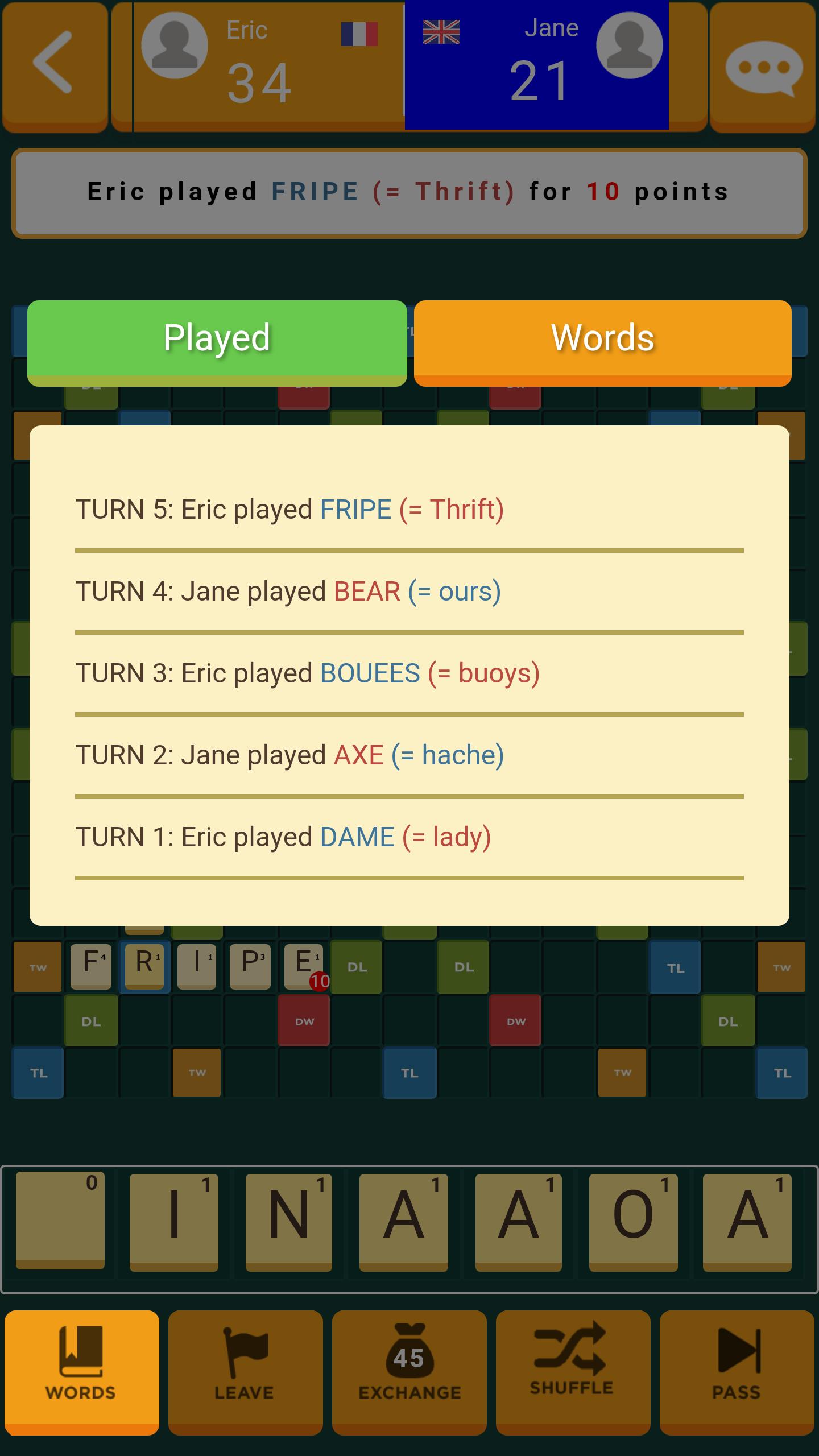 Melhore seu vocabulário jogando em diferentes idiomas e acesso às definições e traduções das palavras jogadas durante o jogo. É sempre mais fácil aprender um novo idioma com diversão :)