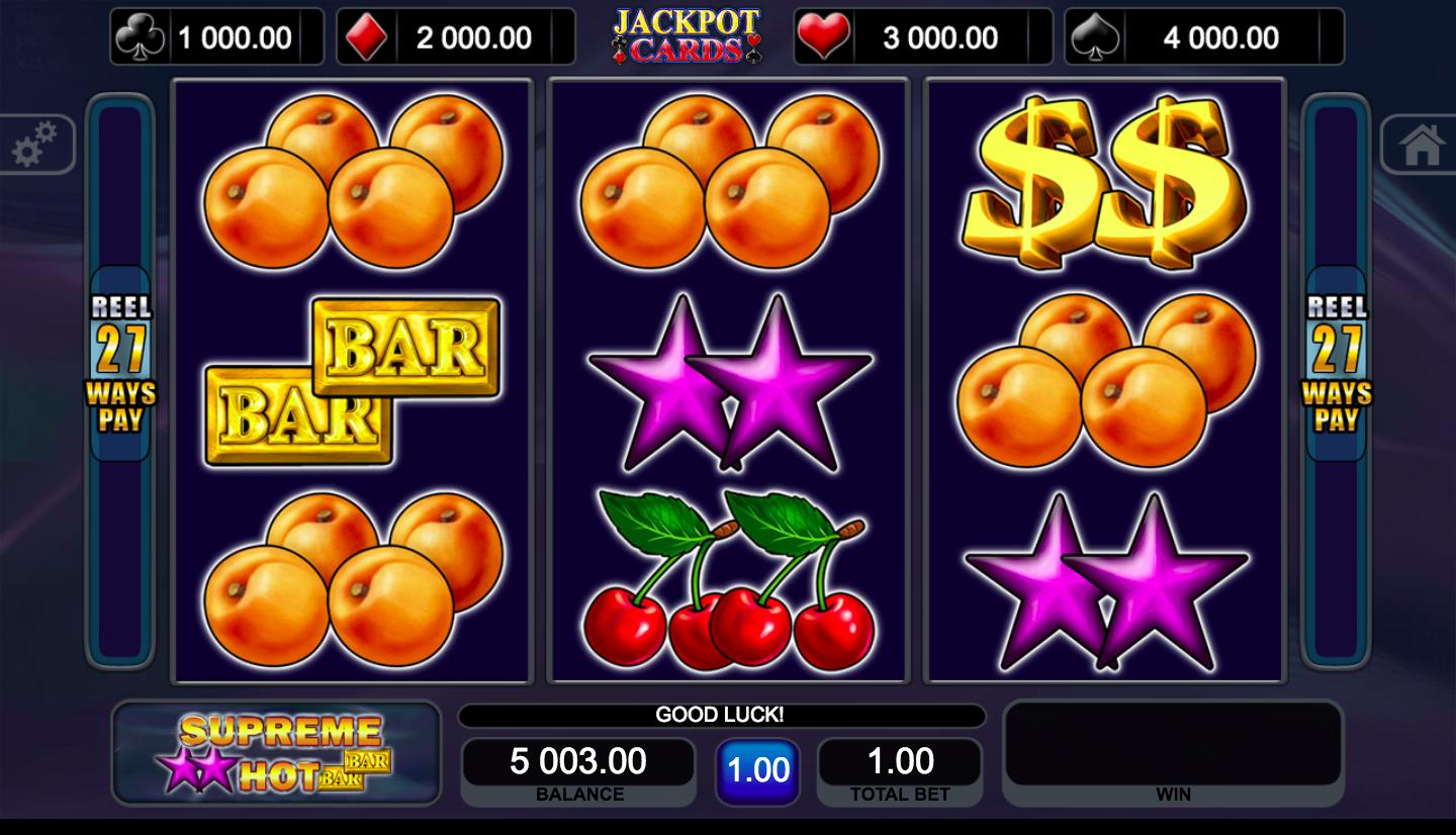 A Supreme Hot Gaming Machine com 3 bobinas convida você a se encontrar com bandidos clássicos de um braço. O prêmio mais aguardado é o jackpot progressivo. Pode ser vencido em uma rodada especial, onde você precisa virar três cartas do mesmo terno. Cada rotação no modo principal pode trazer até 1.000 créditos. Os pagamentos podem ser aumentados em um jogo de risco.