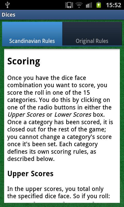 É um jogo de estratégia em que você tenta obter a pontuação mais alta. Você decide se vai jogar com regras "originais" ou regras "escandinavas".