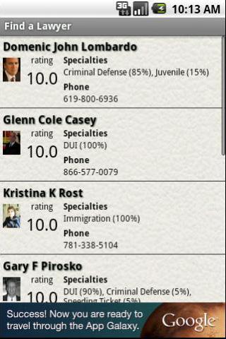 Найдите обзор адвоката, прежде чем нанять его, никогда не было таким простым. Вы просто вводите ключевое слово для поиска, к счастью, вам поможет опция Auto Complete, затем ваше местоположение, приложение также поможет с Auto Complete Option, (поэтому приложение будет искать юриста, ближайшего к вашему местоположению). Нажмите поиск, и поиск начнется. Когда показанный результат, просто нажмите одного из перечисленных там адвокатов, затем вы получите его подробности, включая номер телефона, адрес, рейтинг, образование, даже обзоры от предыдущих клиентов.