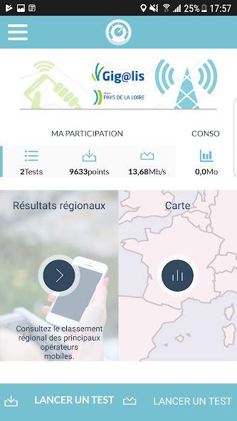 Предлагаемая совместная ассоциация Pays de la Loire, Gigalis Tool позволяет измерить скорость и качество обслуживания соединений 2G / 3G / 4G вашего оператора (Orange, SFR, Bouygues-Telecom, бесплатный, девственная мобильная ... и т. Д.)