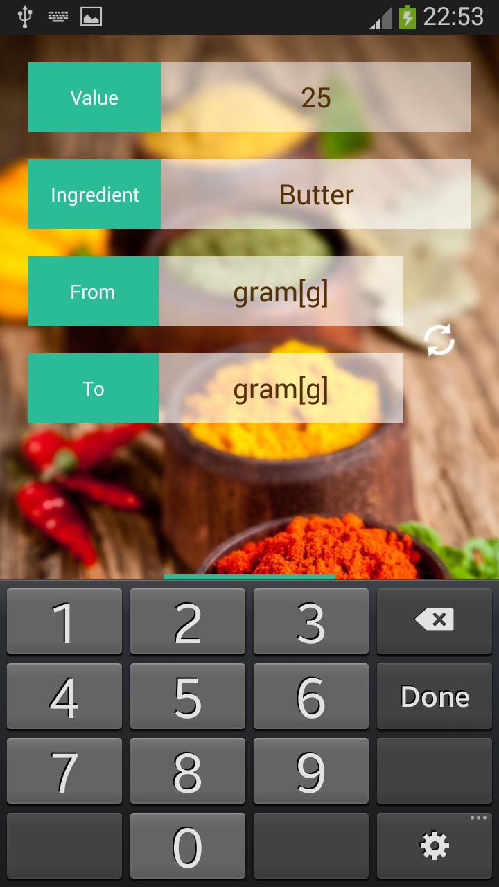 Приложение позволяет легко преобразовать вес в кухню. Вы можете преобразовать вес и объем в килограммы в миллилитры, литры, чайные ложки, столовые ложки, чашки или обратное;