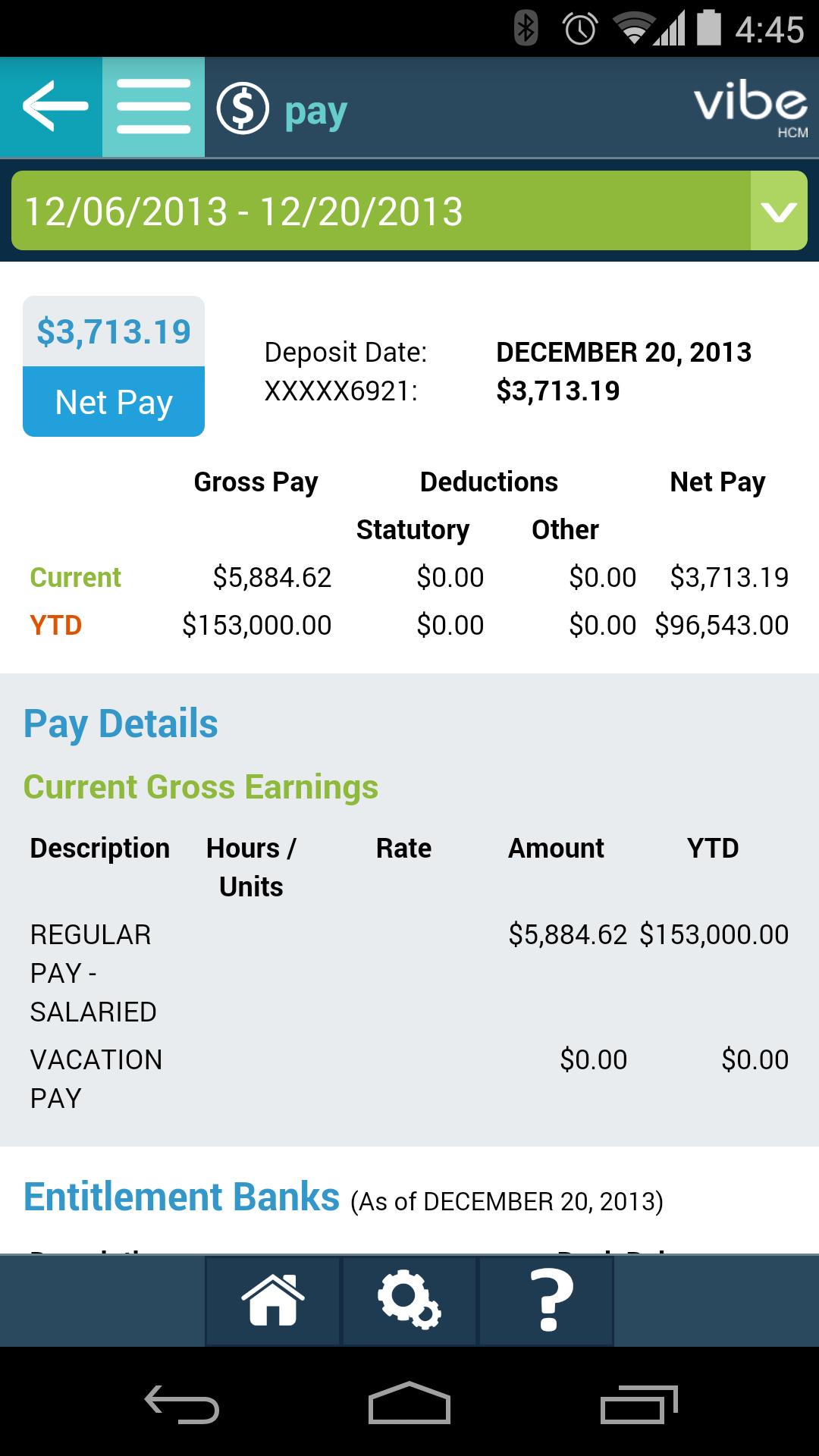 С помощью приложения « Vibe HCM » в настоящее время вы можете просмотреть свои текущие и исторические выписки по оплате, в том числе валовые доходы, вычеты, банки по правам и оплату YTD, причем в будущем гораздо больше функциональности.