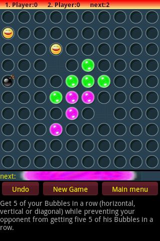Победитель - первый игрок, который получает непрерывный ряд из 5 пузырьков по горизонтали, вертикально или диагонали.