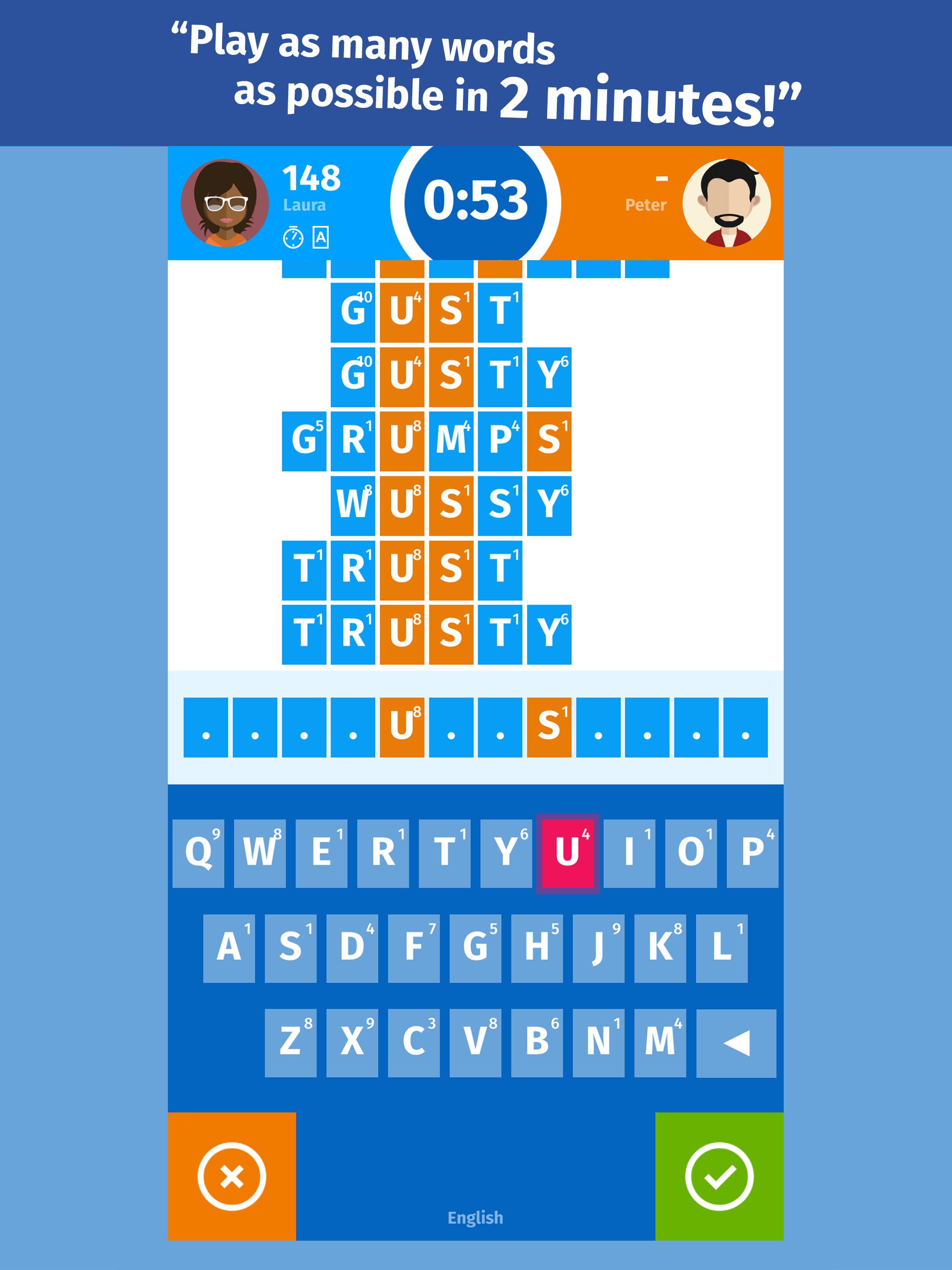 Играйте против друзей, семьи и случайных противников. Игрок, который сначала выигрывает 3 раунда, является победителем матча. Вы также можете использовать бустеры, такие как двойное значение слова, чтобы дать вашему счету этот маленький импульс победите!