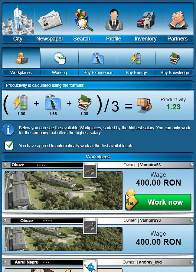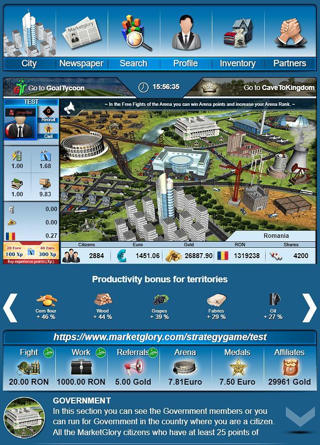 MarketGlory - это массовая игра в браузер, в которой все виртуальные карлики можно обмениваться на реальные деньги. Это экономический, политический, социальный и военный симулятор, где вы можете использовать свою местную валюту в вашей выгоде. У каждого игрока из сообщества MarketGlory есть возможность: работать, создавать компании, баллотироваться на правительстве, рекомендовать рефералы, получить военные ряды и построить свою собственную организацию.
