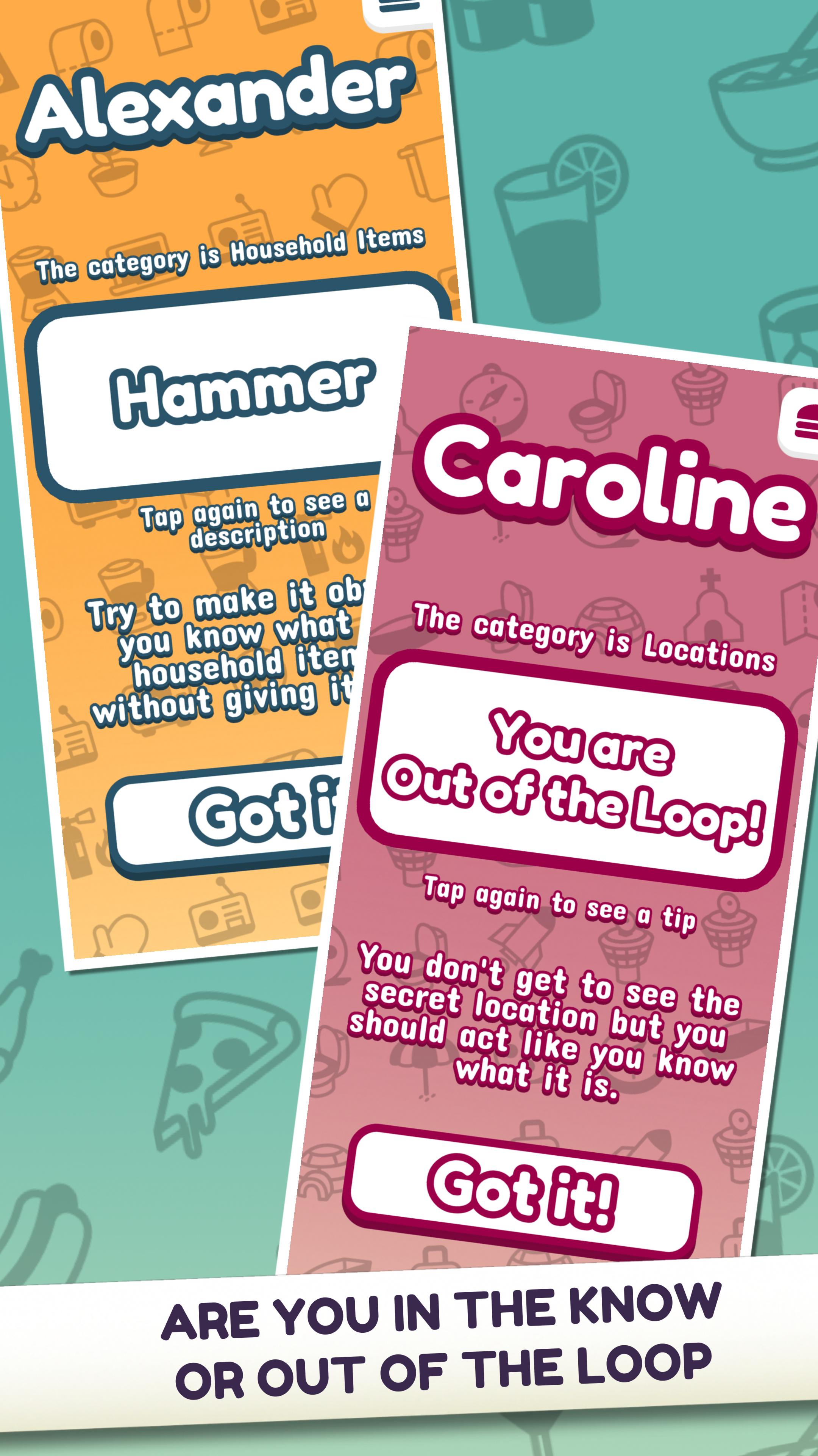 Выбрав категорию для раунда, каждый игрок либо узнает секретное слово в категории, либо Out of the Loop . Затем каждый игрок продолжает отвечать на один вопрос об этом словом, прежде чем голосовать за то, кто, по их мнению, Out of the Loop . У кого -то был подозрительный ответ? Разве они не смеялись над мыслью о пончиках, заполненных пончиками? Голосуй за них!
