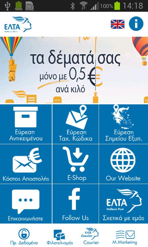 แอปพลิเคชันนี้เป็นแอปพลิเคชันอย่างเป็นทางการของ Hellenic Post SA (Elta) ผู้นำตลาดไปรษณีย์ในกรีซสำหรับ Android อบแอปพลิเคชัน ELTA และใช้ประโยชน์จากบริการที่เป็นนวัตกรรมให้ฟรี- ตรวจจับรายการไปรษณีย์ของคุณ- คำนวณค่าขนส่ง- ค้นหารหัสไปรษณีย์ที่คุณต้องการโพสต์กรีก SA ( ELTA ) ผู้นำตลาดไปรษณีย์ในกรีซสำหรับ Android - อัปเดตรายการร้านค้า