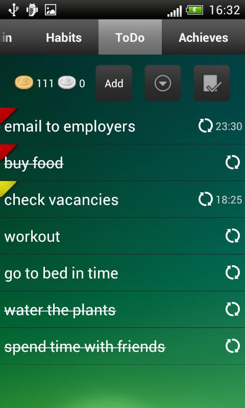 หน้าจอ "นิสัย" คุณสามารถเพิ่มนิสัยที่คุณต้องการฝึกฝนและสิ่งที่คุณต้องการออกไป นิสัยที่ดีได้รับรางวัลจากเงินและประสบการณ์ หลังจากนิสัยที่ไม่ดีถูกลงโทษโดยการลงโทษ ตัวอย่างของนิสัยที่ดี - "เดินขึ้นบันได", "การออกกำลังกายเล็ก ๆ หลังจากแต่ละชั่วโมงทำงาน"