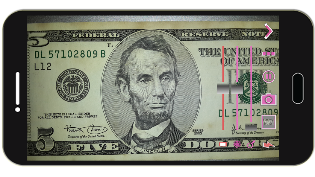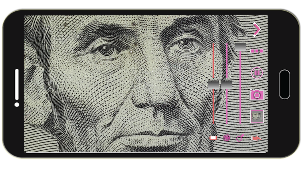 เมื่อคุณเริ่มกล้องแอพจะตั้งค่าการซูมแว่นขยายเป็นค่ากลาง คุณสามารถลากบาร์ซูมซูมเพื่อให้แว่นขยายซูมเข้า/ออก (หรือใช้สองนิ้วเพื่อให้แว่นขยายซูมเข้า/ออก)