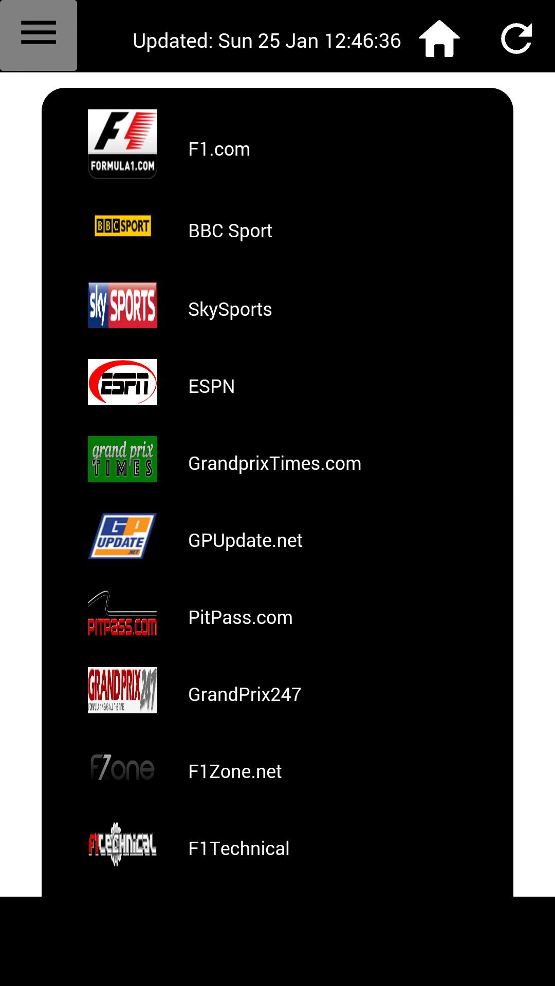แหล่งที่มารวมอยู่ในฟีดข่าว Formula 1; f1.com; bbc.co.uk; Skysports.com; espnf1.com; Grandprixtimes.com; thef1times.com; gpupdate.net; pitpass.com; grandprix247.com; f1zone.net; f1technical.net; f1fanatic.co.uk; Motorsport.com; f1pulse.com