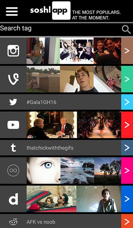 SoshlApp กำลังรวบรวมและรวมเนื้อหาที่ได้รับความนิยมมากที่สุดจากโซเชียลมีเดียบางส่วน Twitter, Instagram, Vine, Reddit, Tmblr, YouTube, Flickr และ Dailymotion