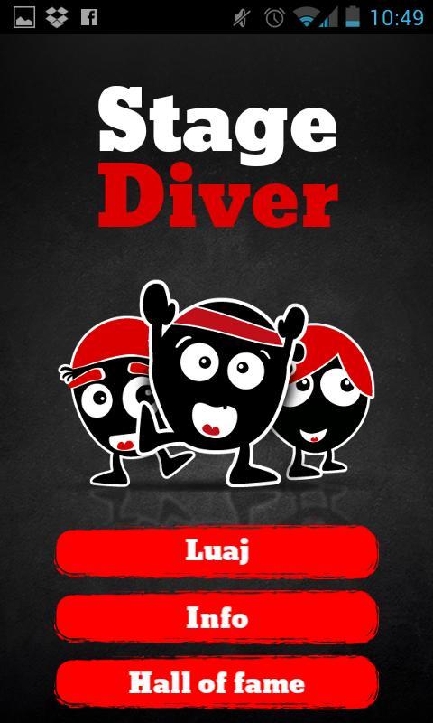 移动应用程序hej!StageDiver适合您的摇滚明星。努力大胆的摇滚明星!分阶段是熟练和大胆的游戏。目标是尽可能长时间地将舞台潜水员放在人群的手上。您将潜水员放在人群上的时间越长,您得到的要点更多!跳入光线越好,您将获得的点越高。摇滚!
