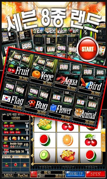 完美的老虎机游戏“七级8级土地”:水果,蔬菜,水上等。