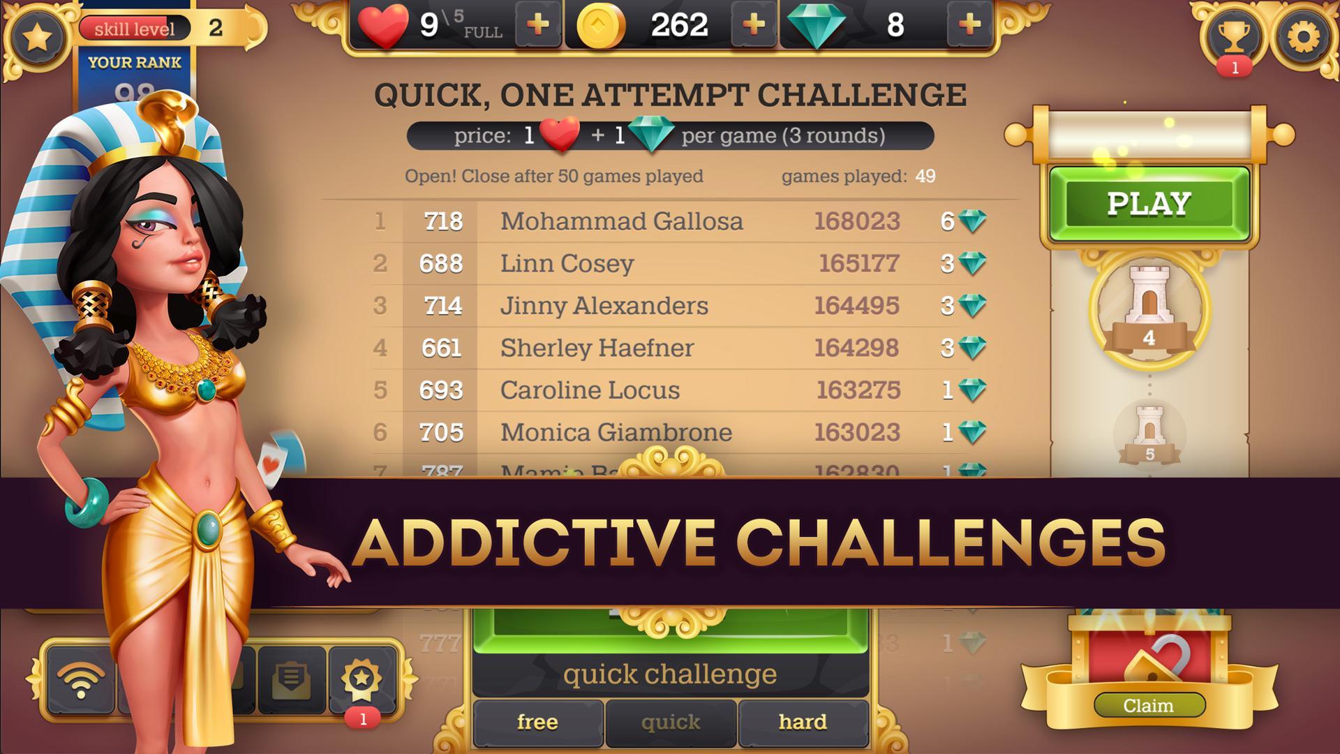 在這款經典的紙牌卡遊戲中,與埃及豔后一起穿越了埃及的奧秘。解決數百個卡難題時,訓練大腦。