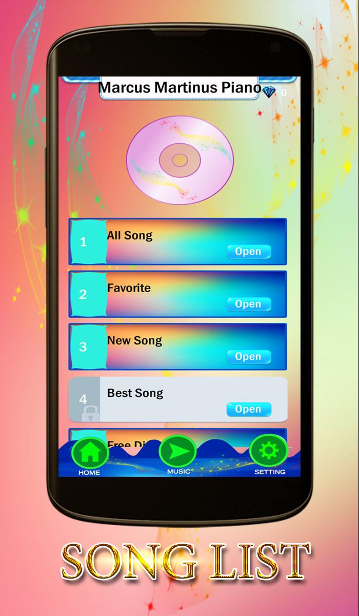 這是一個非常特殊的應用程序,具有驚人的圖形設計。根據要求,欣賞此鋼琴應用程序中的新歌和每一個音樂節奏,並根據要求列出Marcus Martinus的列表: