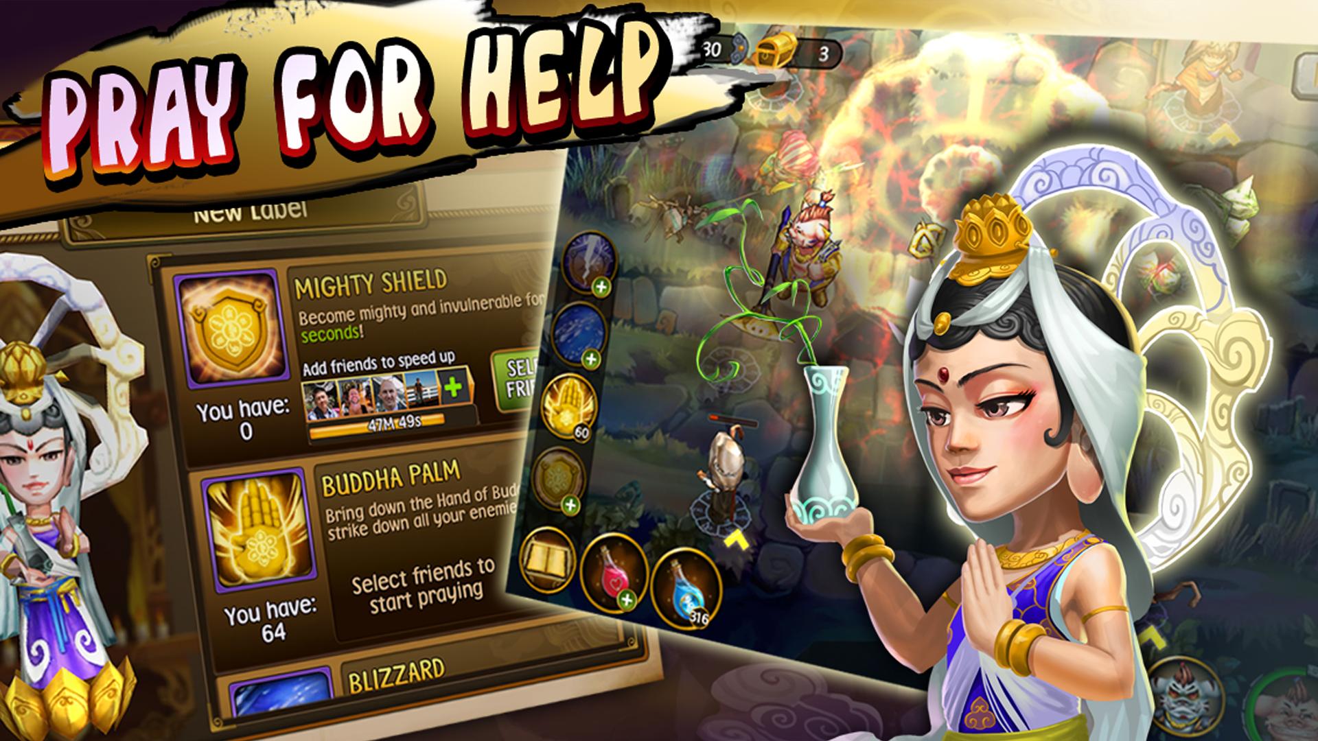 •社交獎勵:在您的Facebook朋友的幫助下贏得天上的炸彈,例如壓碎佛陀,暴風雪,神靈詛咒等等,以降低敵人的天堂!