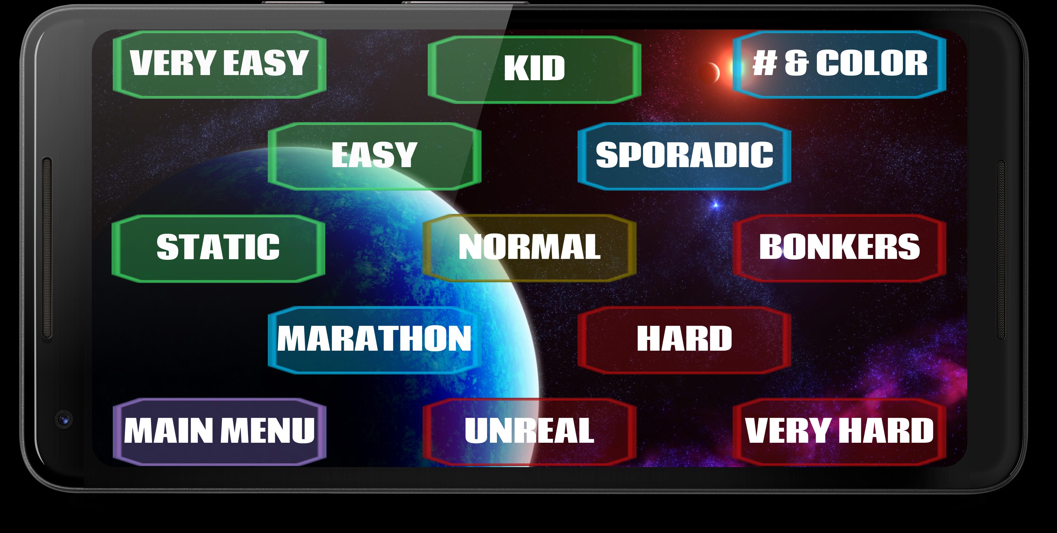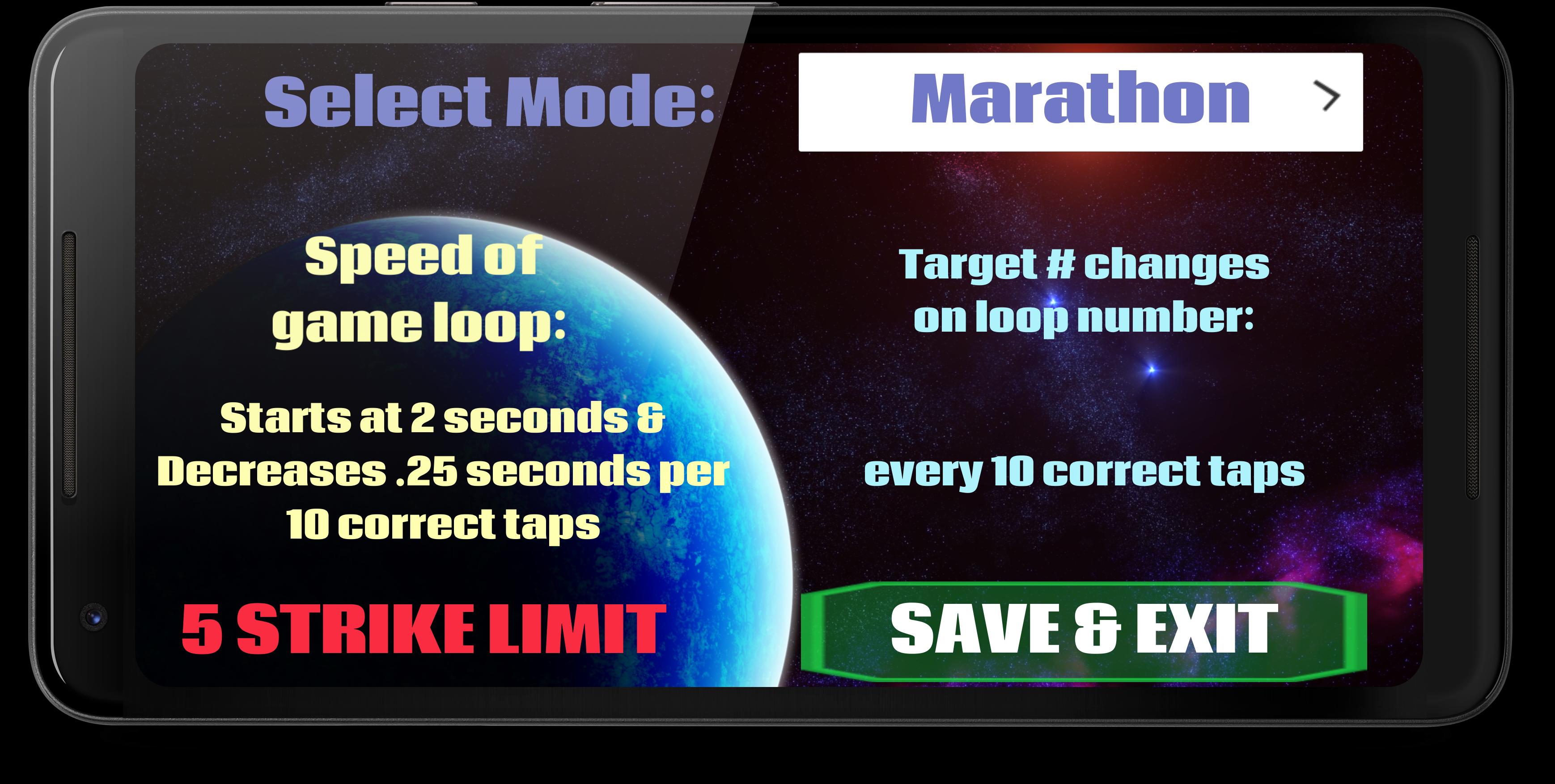 從Kid Mode(Kid總是獲勝)到不允許錯誤的模式,並且每秒都會更改遊戲網格!一種獨特的模式是馬拉鬆比賽,其中目標數變化,速度每10個正確的水龍頭就會增加四分之一秒!另一個有趣的模式是BONKERS,在該模式下按下每個播放網格迭代的目標編號!其他模式包括隨機更改目標號,以及更多。 (可以在設置中查看和更改每個模式的詳細信息)。