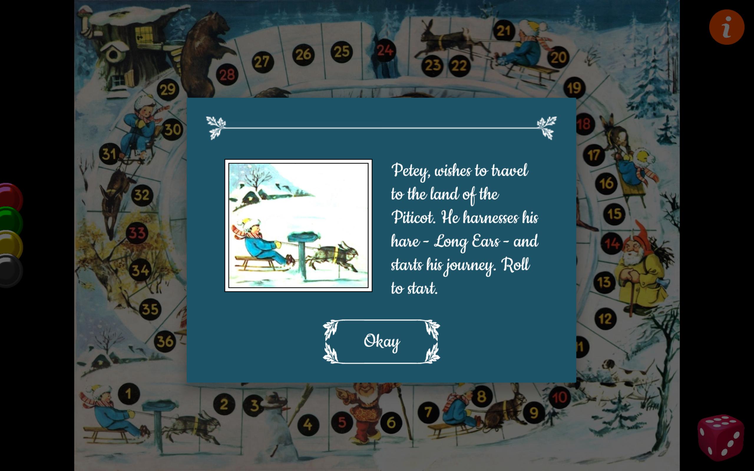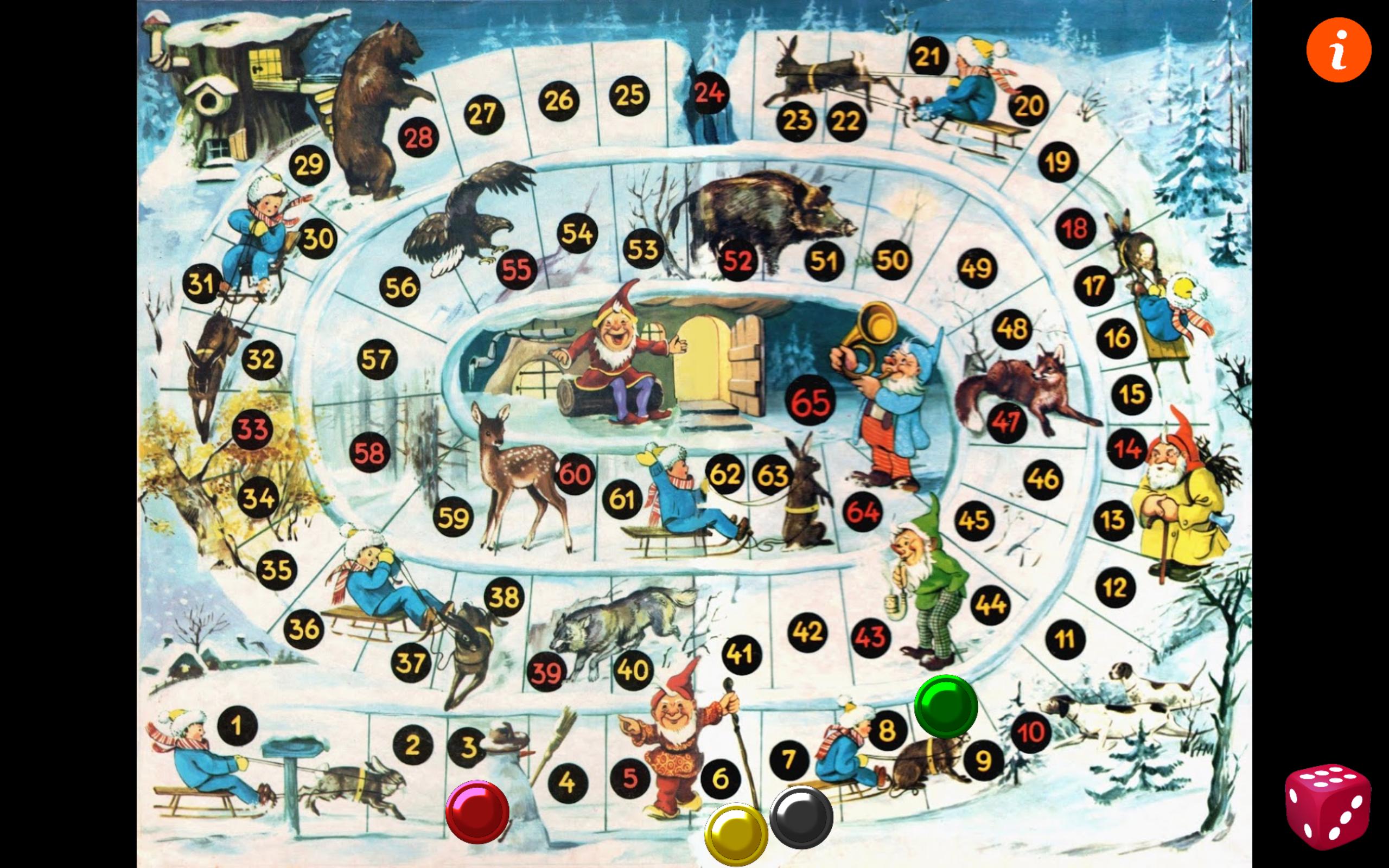 簡單的滾動和移動棋盤遊戲,適用於寒冷的課程4-10歲的玩家。目的是通過擲出更高的骰子得分並避免後退陷阱,在其他球員的領先地位上到達Piticot的小屋。