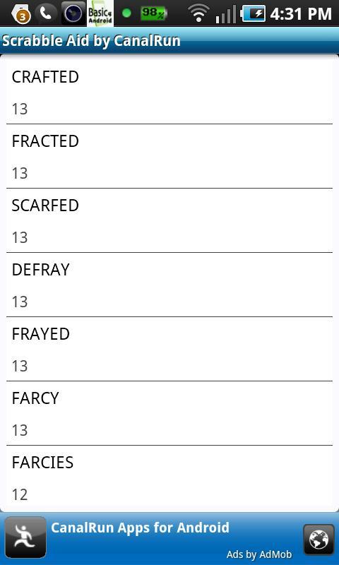 Scrabble Aid是一個應用程序,它將幫助您成為更好的Scrabble™播放器。它將檢查以確保其拼寫字典中有一個單詞,並且可以找到可用的木板和欄字母的字符。它按單詞分數和長度對結果進行分類,儘管它不能說明兩倍和三個正方形。